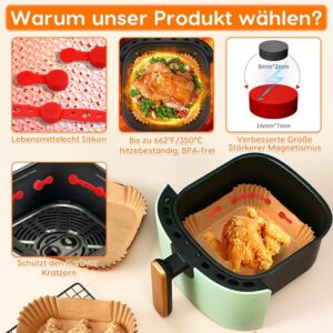 محتويات العبوة: ملحقات أمان لمنع الحرائق والحوادث أثناء الطهي باستخدام مقلاة الهواء الساخن. ستحصل على 8 قطع من مغناطيسات مقلاة الهواء لورق الخبز، بما في ذلك 4 مغناطيسات سيليكون طويلة (10.4 × 1.4 × 0.7 سم) و4 مغناطيسات سيليكون دائرية (3.3 سم). يمكن تعديل الأحجام المختلفة لتناسب مختلف طرازات أو أشكال دلو مقلاة الهواء لديك. هذا يسمح بعملية طهي أنظف وأكثر كفاءة وأمانًا، وهو ما يكفي للاستخدام اليومي وللاستبدال المنتظم.