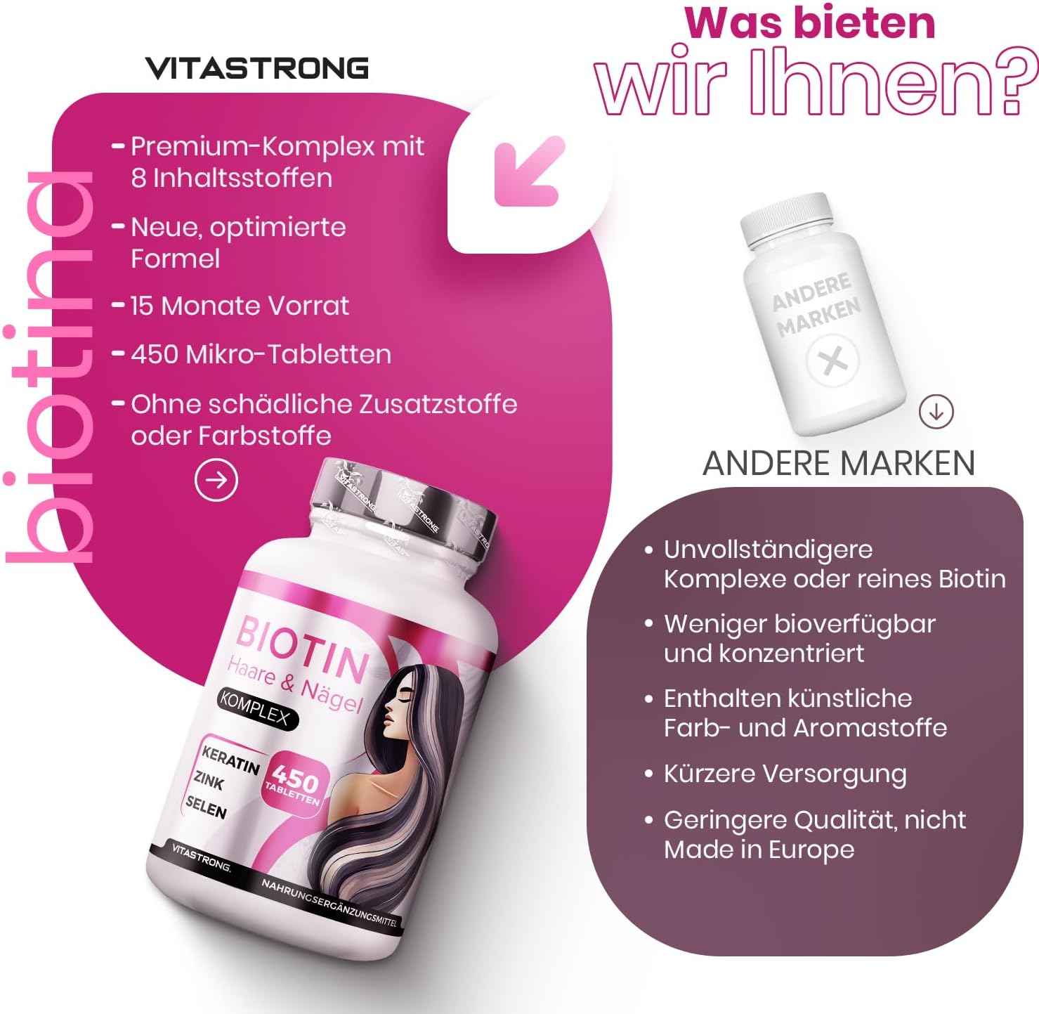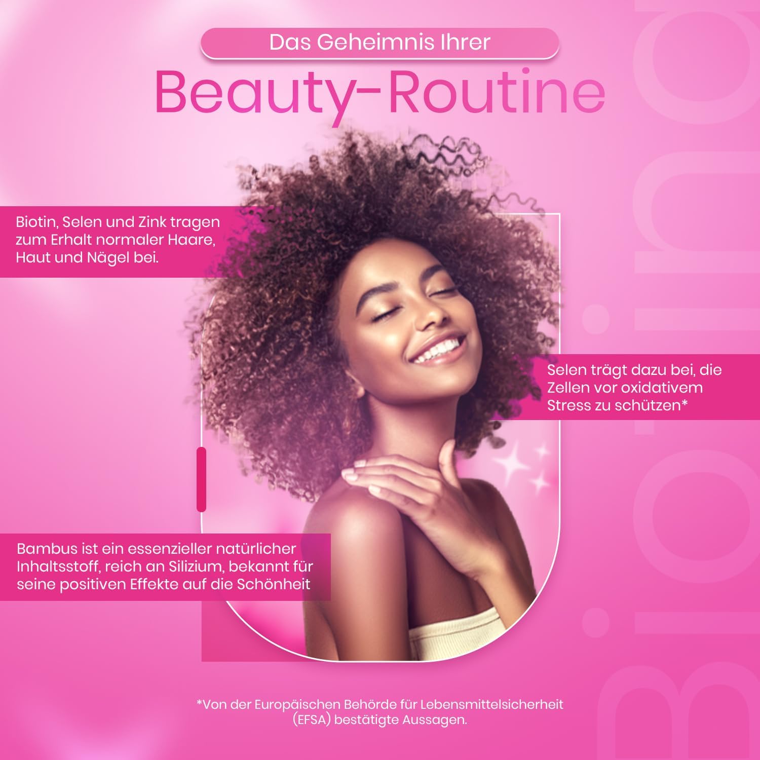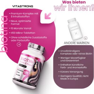 فوائد معتمدة من الهيئة الأوروبية لسلامة الأغذية: اكتشفي التركيبة الفريدة لمركب فيتاسترونغ للبيوتين والزنك والسيلينيوم. وفقًا للهيئة الأوروبية لسلامة الأغذية، يساهم البيوتين والزنك والسيلينيوم في الحفاظ على صحة الشعر والبشرة والأظافر، بينما يساهم النحاس في تصبغ الشعر الطبيعي. فيتامين هـ مضاد أكسدة ممتاز، يحمي الخلايا من الإجهاد التأكسدي، بينما يدعم فيتامين د وظائف المناعة الطبيعية. اختاري مركب البيوتين لجمالك الطبيعي – كل يوم.