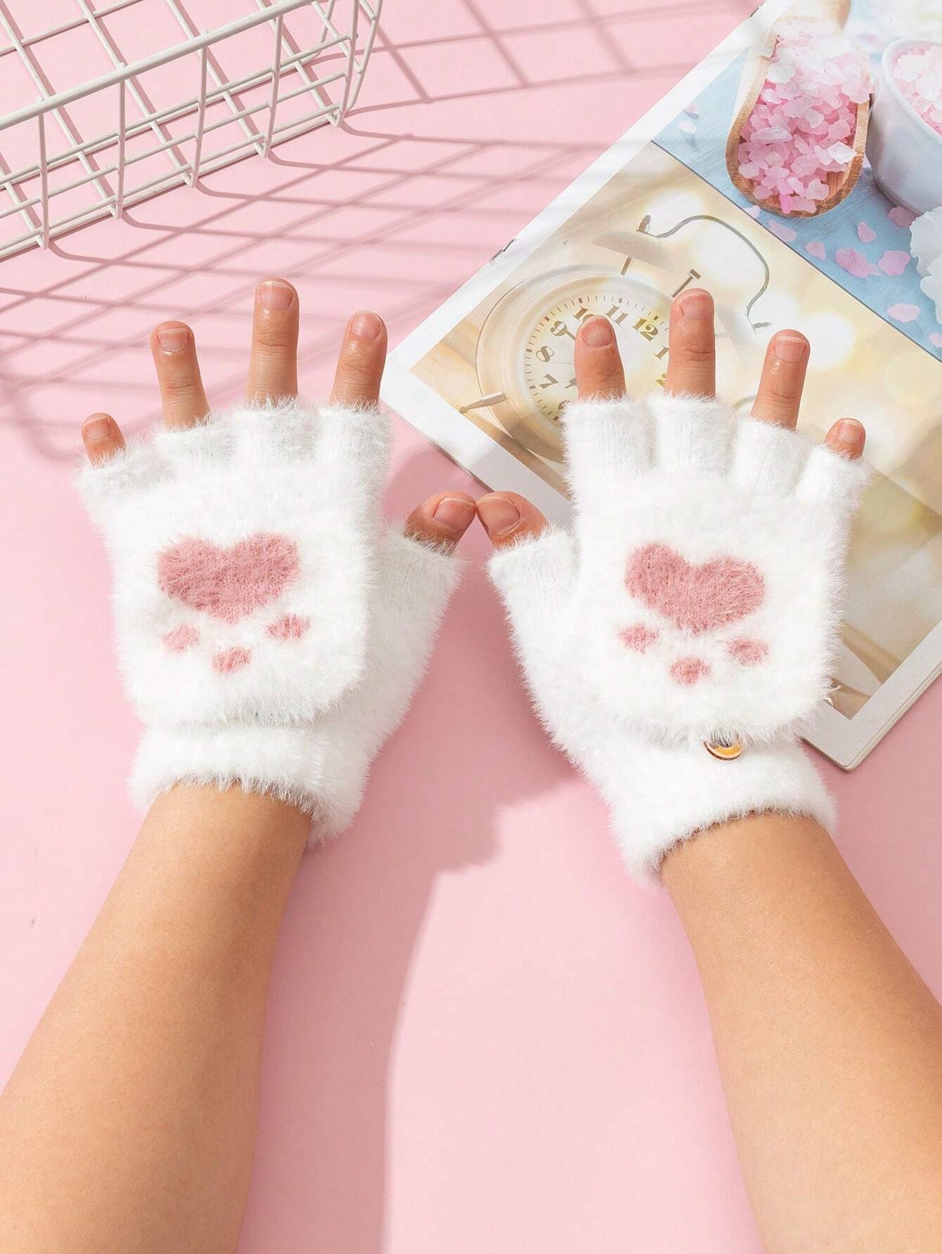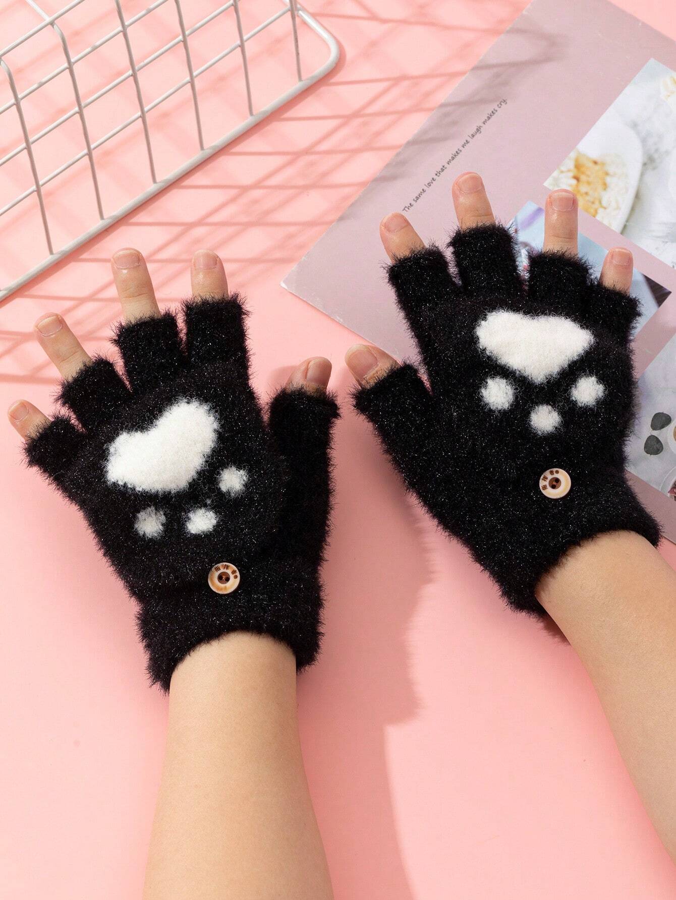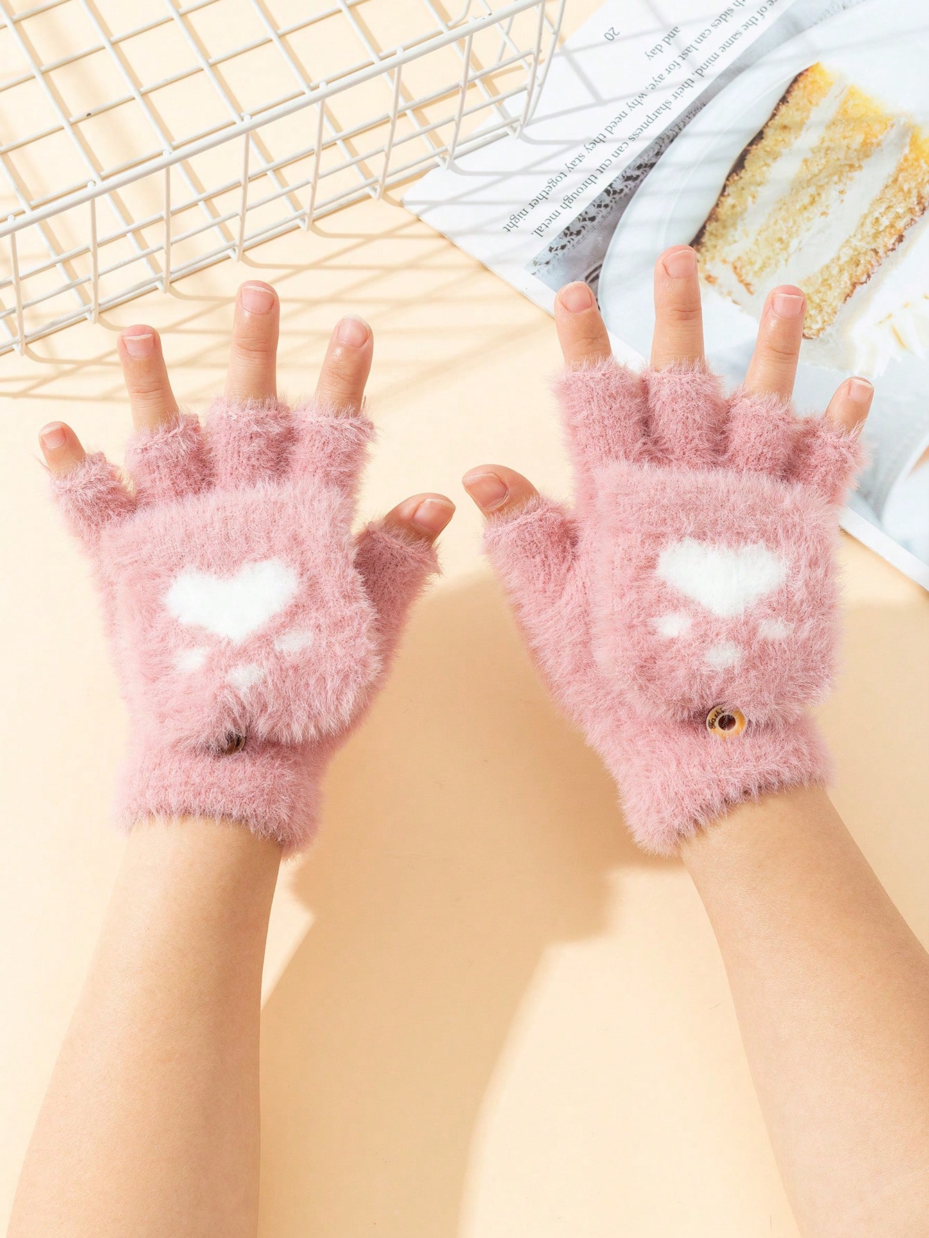 مناسب للأعمار من 3 إلى 12 عامًا زوج واحد من قفازات نصف الإصبع القطيفة للأطفال للجنسين بنمط قلب ومخلب قطة للدفء والحماية، مثالية للاستخدام في الهواء الطلق في الخريف/الشتاء