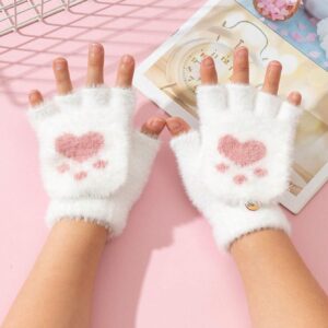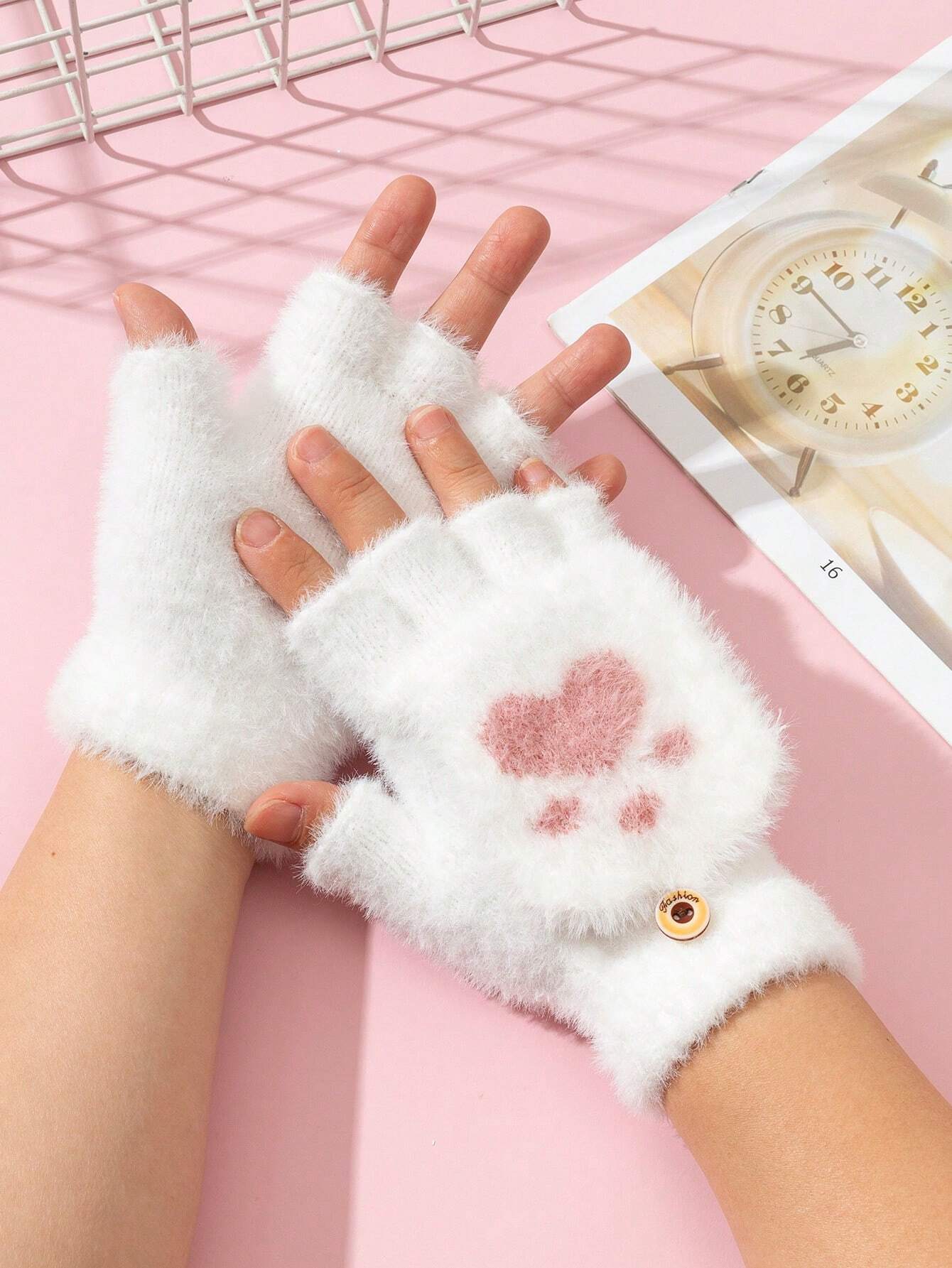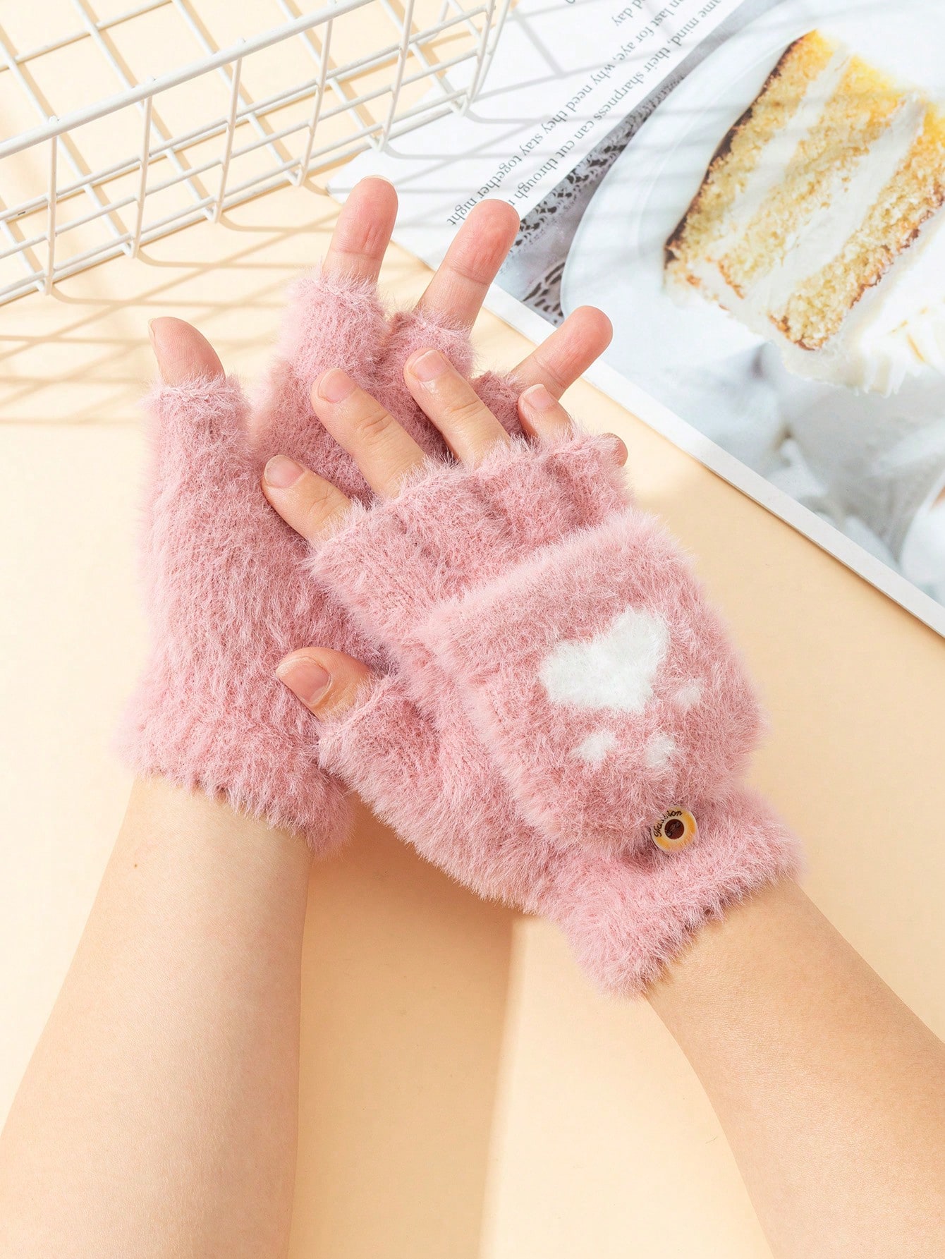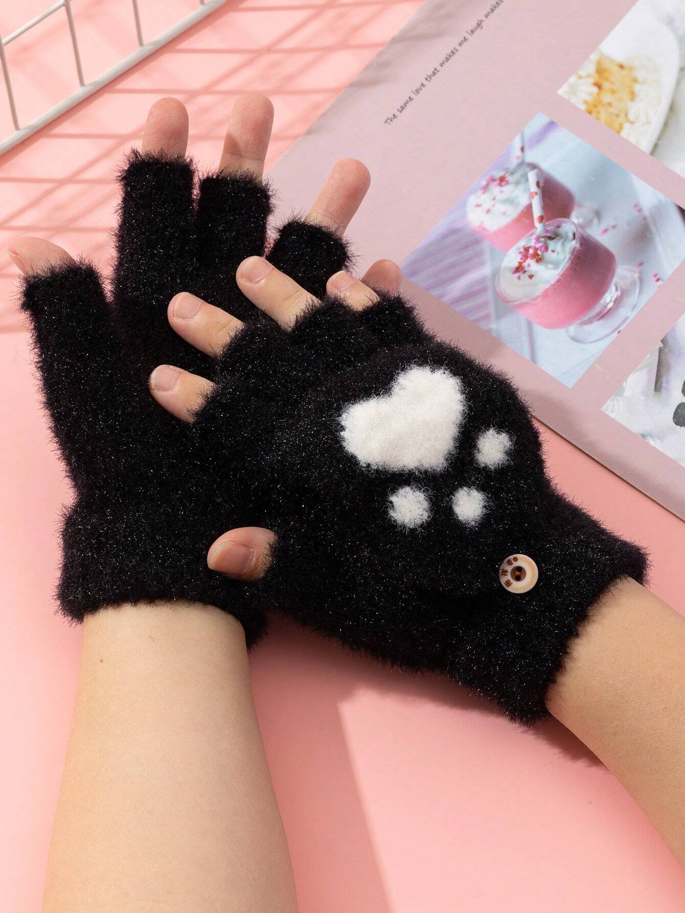 مناسب للأعمار من 3 إلى 12 عامًا زوج واحد من قفازات نصف الإصبع القطيفة للأطفال للجنسين بنمط قلب ومخلب قطة للدفء والحماية، مثالية للاستخدام في الهواء الطلق في الخريف/الشتاء